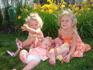 The Kreider's came down on Friday to visit for the weekend. It was so great to see them again. We hadn't seen them since Mylee was 2 weeks old and she is now 3 months old. She's grown a lot in the last few months and is still as sweet as ever. Right now there seems like there is a big difference between the 2 girls but they are only 2 months apart. It will be fun to watch them grow up together. Rylee and Maddy had fun together again as well. We all went to the pool on Saturday but I forgot my camera. Jac had hers so I'll have to get some pics from her. We tried to get a picture of the 4 girls together but it didn't go so well. Maddy and Rylee both wanted to hold Sadie (poor Mylee) so Rylee wasn't to happy that she didn't get to hold her sister. Oh well, maybe the next time we're together we'll get a better picture.